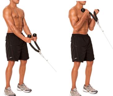 >> Ejercicio #1: Curl de bíceps con barra y agarre en pronación + Curl de bíceps con cuerda en polea baja, al subir abrir.